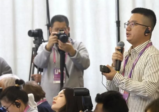 王君寶在第九屆亞冬會新聞發(fā)布會采訪現(xiàn)場提問。